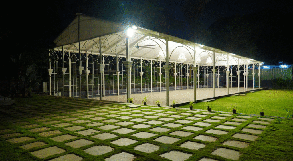 Vatika transforms your events into fairy-tale affairs with its lush lawns, elegant German tents, and nature-kissed ambiance. Perfect for outdoor weddings, cocktail receptions, and sunset soirees, this venue blends rustic charm with luxury. Think floral arches, twinkling fairy lights, and breezy open-air revelry.